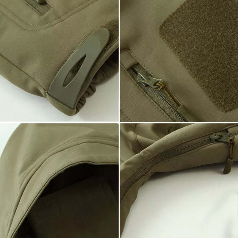Design: Military tactical design with stand-up collar and full zip up, patch on each arm.