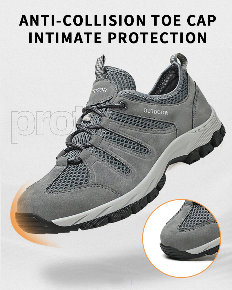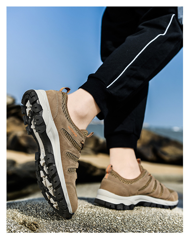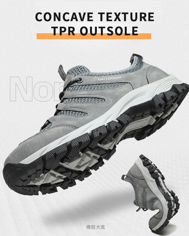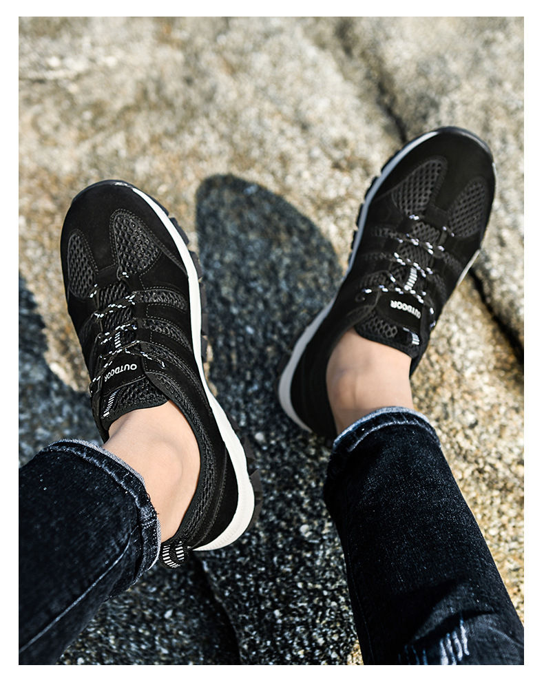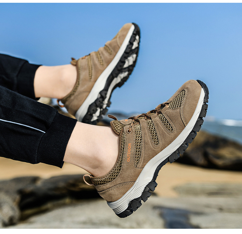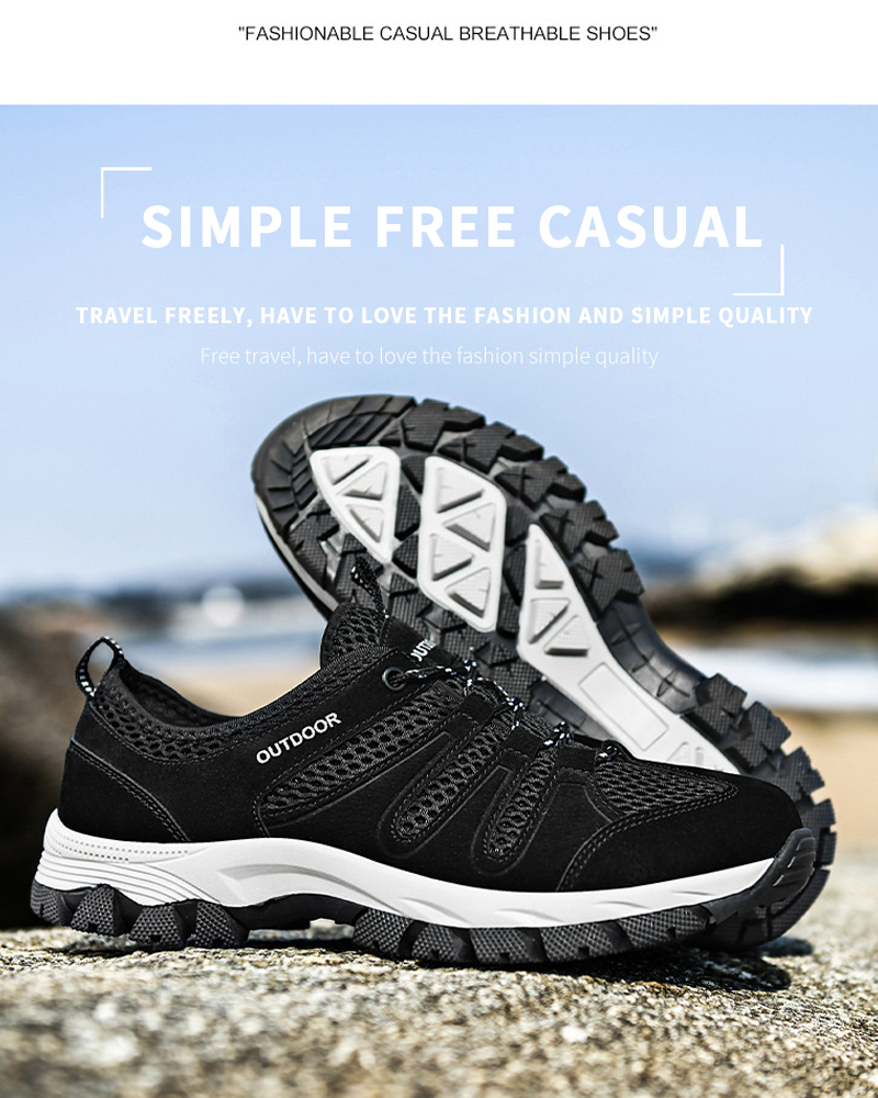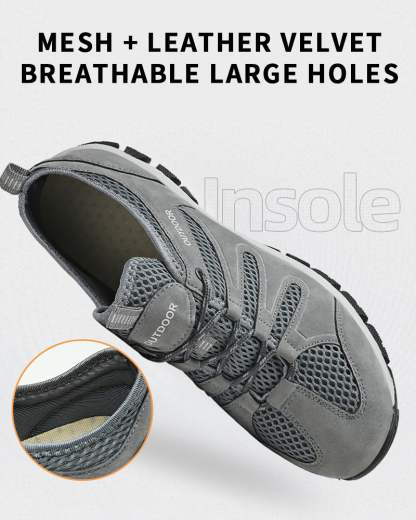 A men's outdoor shoe designed to provide breathability and comfort for activities such as hiking and climbing. The shoe appears to have a mesh surface, a breathable material that allows air to circulate to keep feet cool and dry. The hollow design can also help ventilation and breathability.